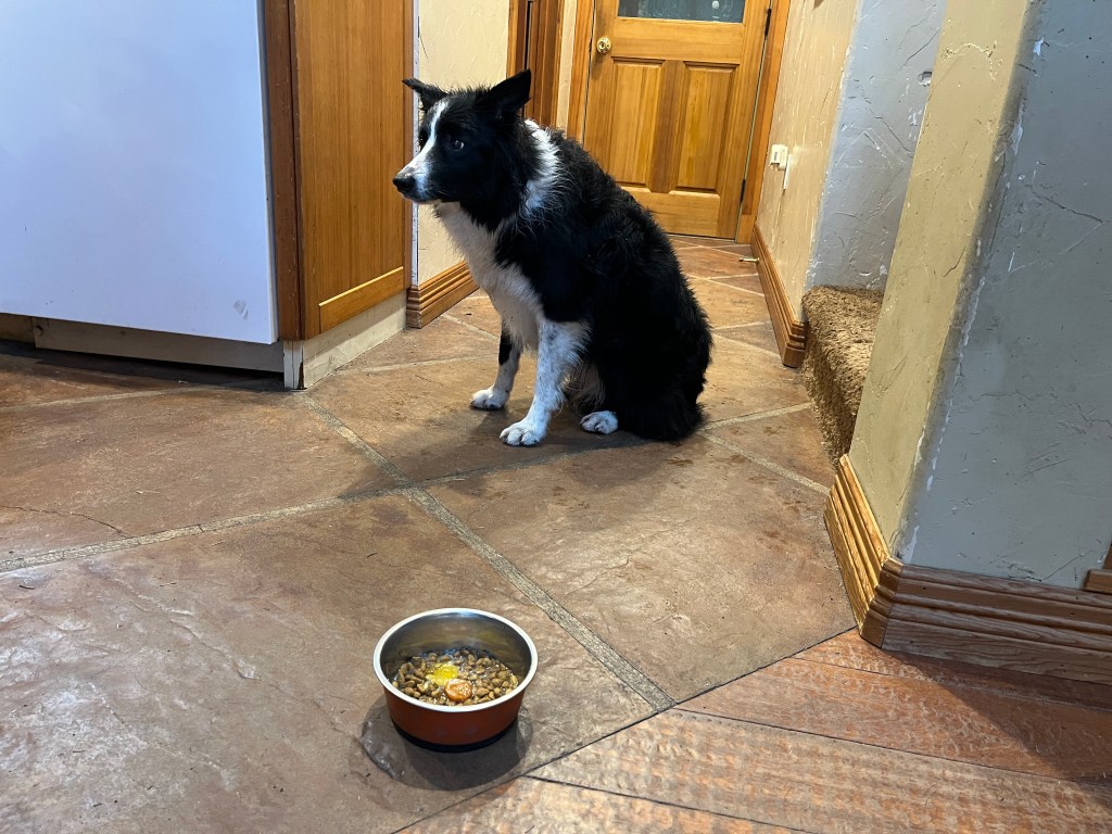 Step 2: Have the dog sit patiently while it waits for its bowl. Use a leash to control her movement and ask for a sit. With a brand-new puppy, it’s ok to build this slowly each day, asking for more and more patience each day.